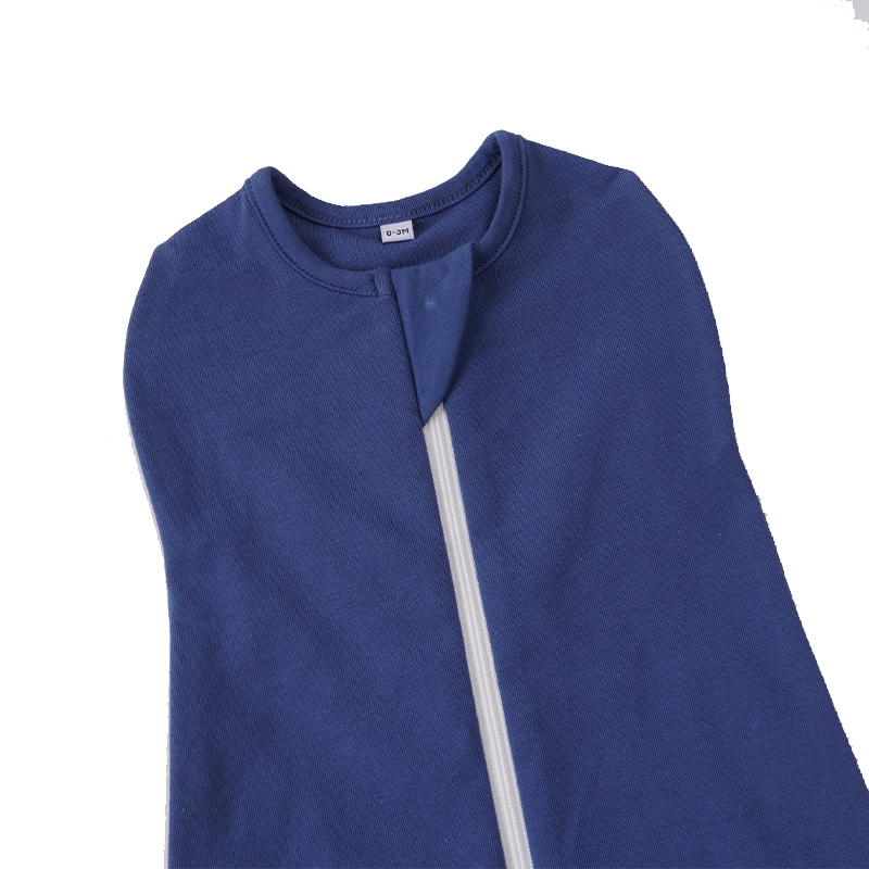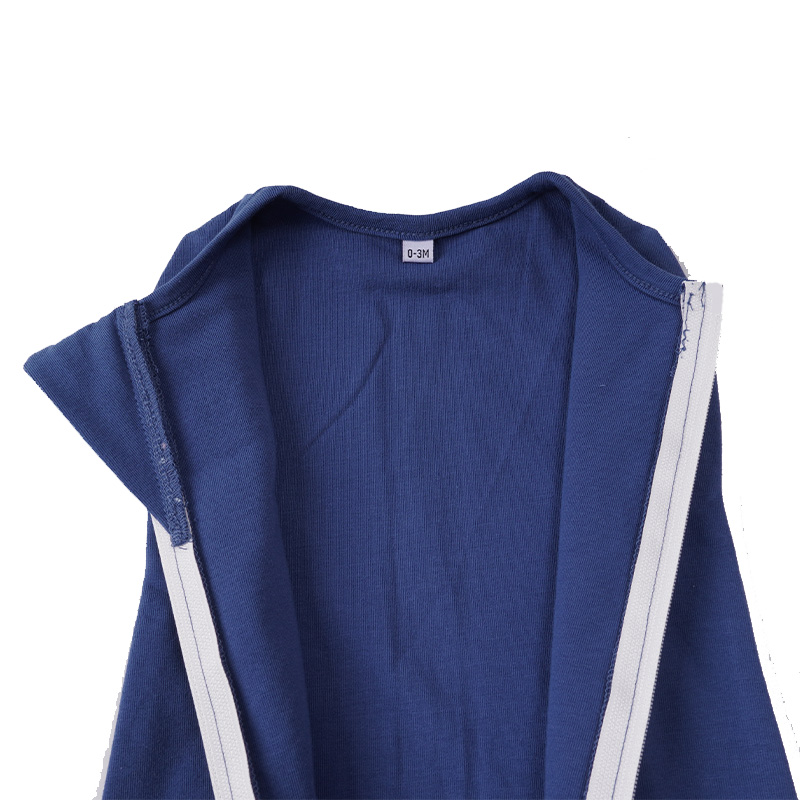 This baby sleeping bag is made from 95% cotton and 5% spandex in double-layer jersey, offering soft stretch, breathable comfort, and a practical structure for infant sleep programs. The zip-front sleep sack silhouette is suitable for everyday baby sleepwear collections and coordinated newborn essentials lines.